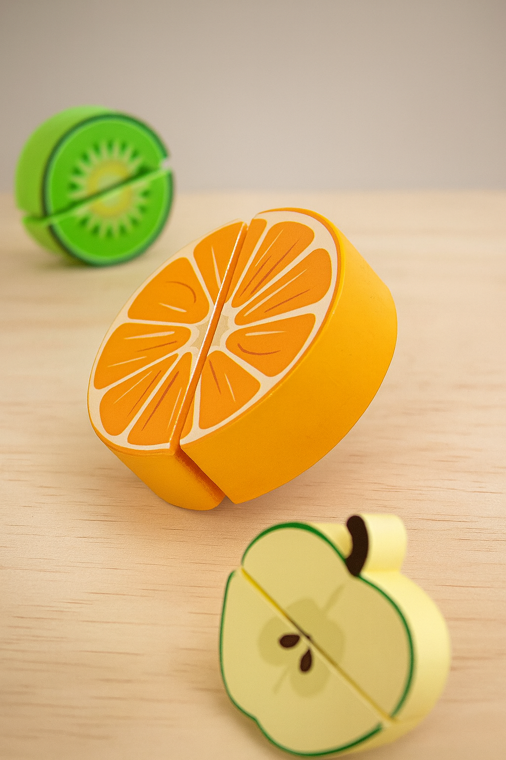 Das Schneiden und Zusammensetzen der Früchte unterstützt Hand-Auge-Koordination, Geschicklichkeit und die Kraftdosierung der Hände – spielerische Motorikförderung ab dem ersten Schnitt.