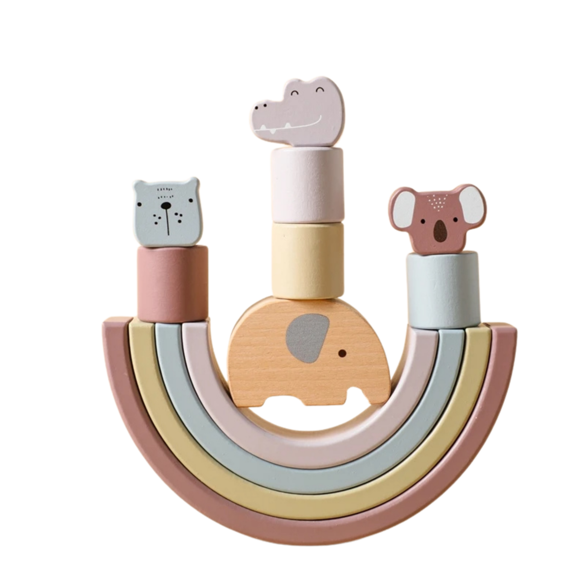 Der Regenbogen Stapelblock wurde aus Holz gefertigt und mit ungiftiger, wasserbasierter Farbe veredelt.